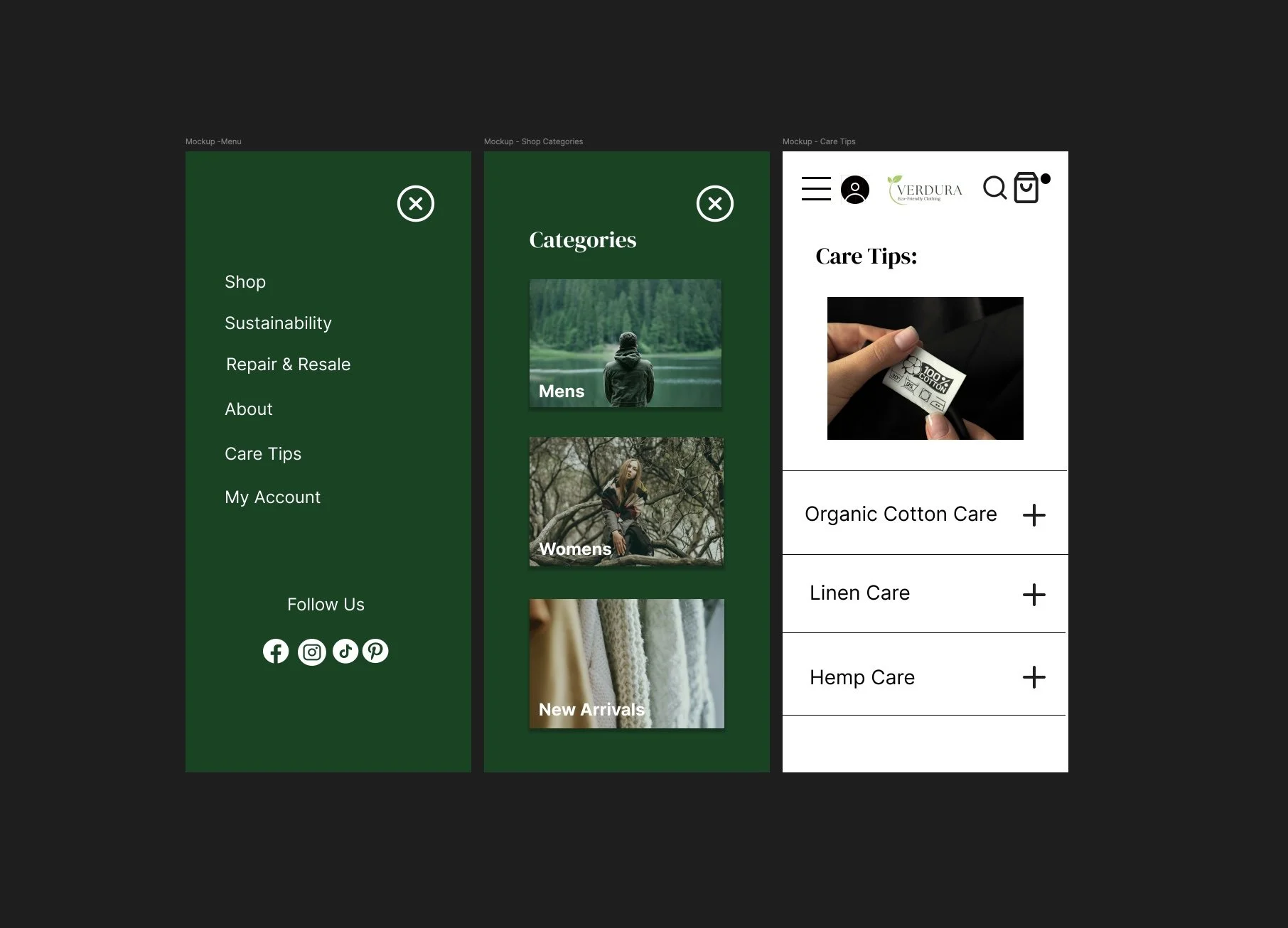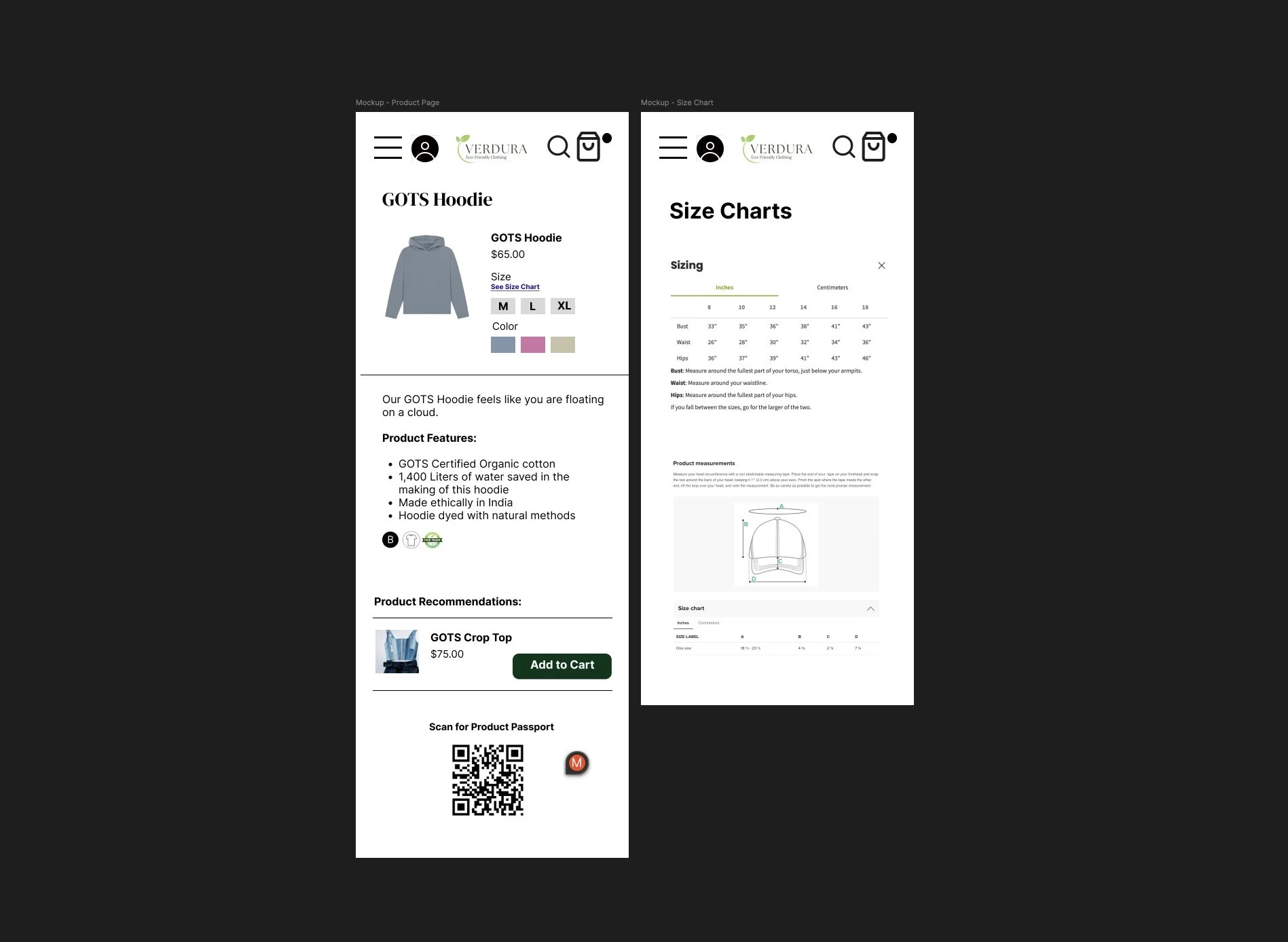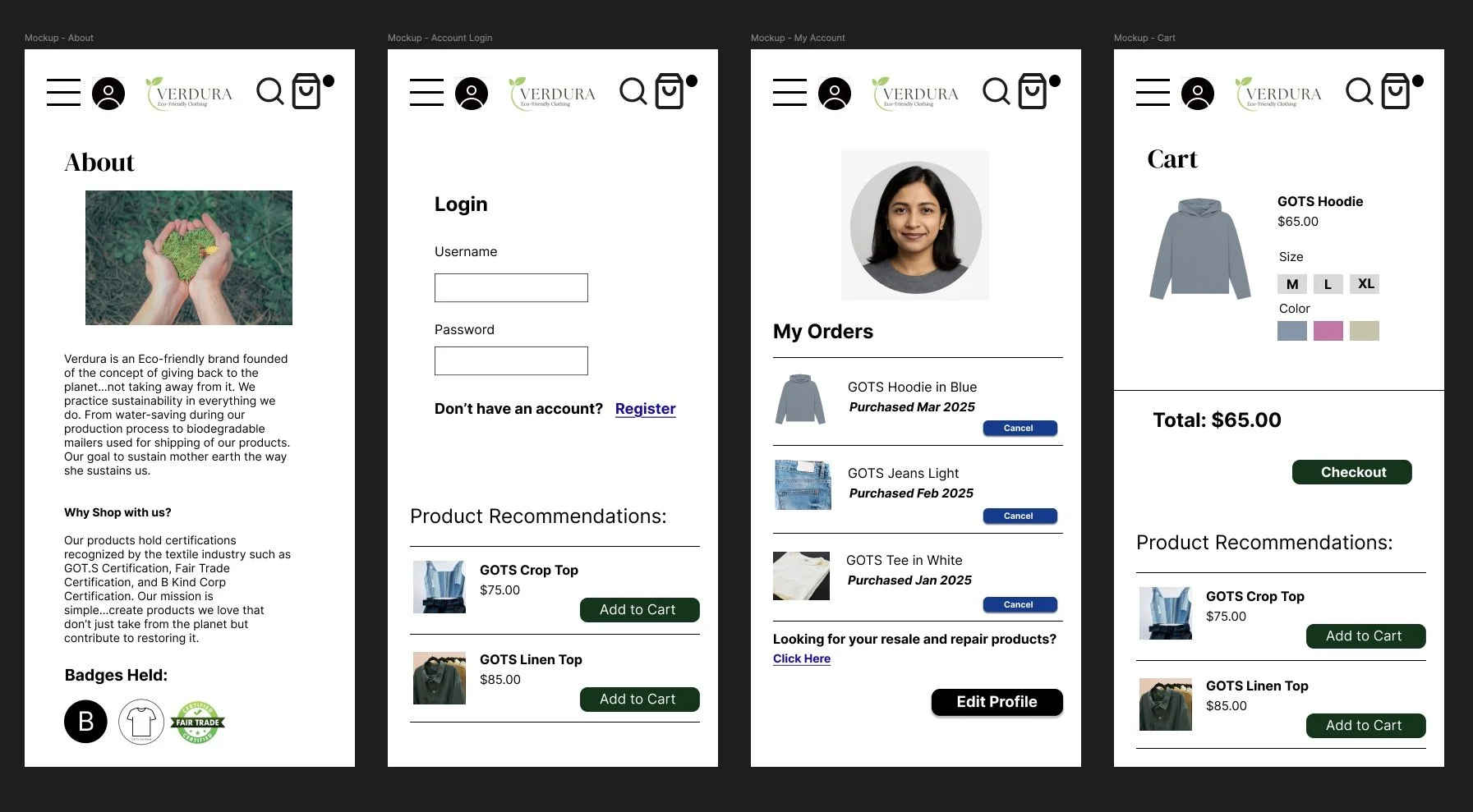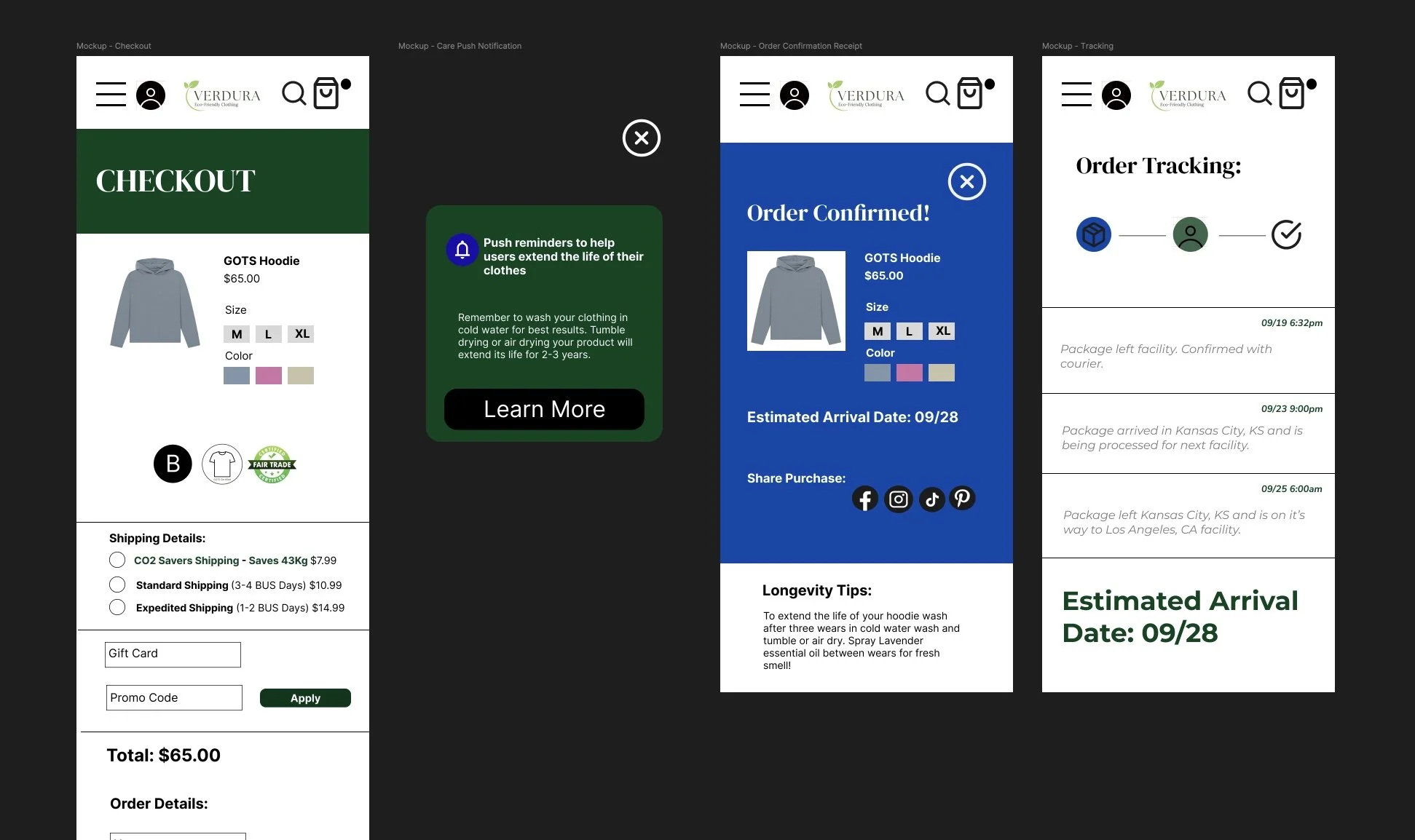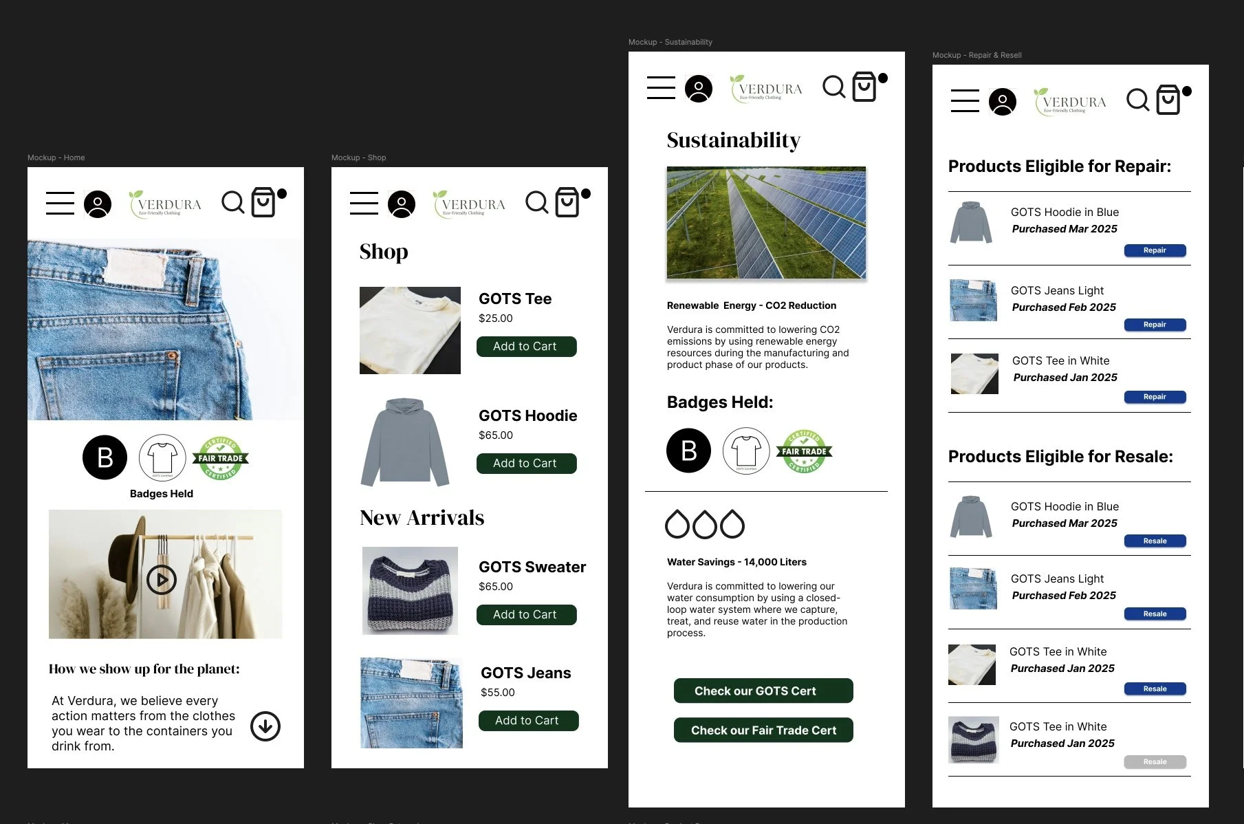 Verdura is an eco-fashion concept designed to make sustainability transparent, accessible, and intuitive for online shoppers. Through user research and iterative design, I uncovered pain points around trust in eco-claims, confusing product details, and friction at checkout.